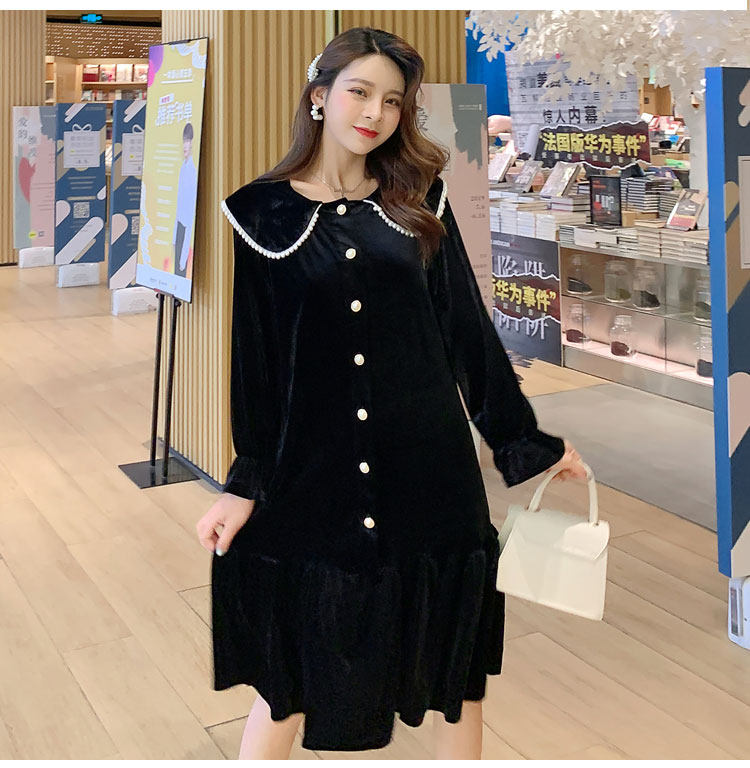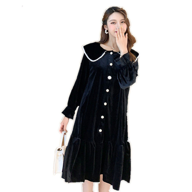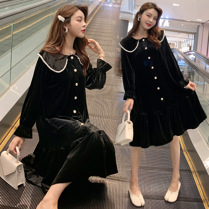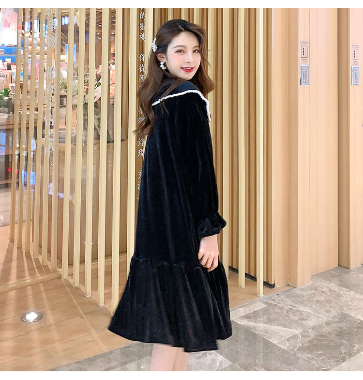 Large size pregnant women autumn Korean version of retro skirt velvet dress velvet temperament dress loose medium and long version of pregnant mother base shirt tide
