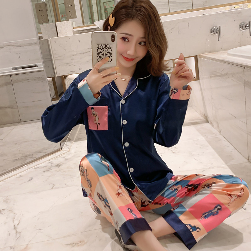 Ice silk sleepwear women's spring and autumn long sleeves 2019 new tidal surges suit Korean version sweet and cute autumn silk home clothes