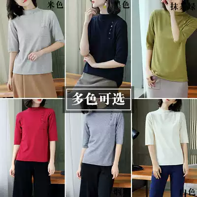 Mom five-point sleeve T-shirt spring and autumn top Middle-aged women's autumn half-sleeved short sweater Western style knitted bottoming shirt thin section