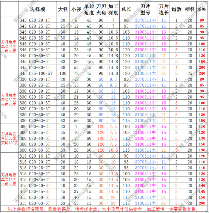 Angle Diameter Diameter Tooth Number Blade Model 45 degree C20-20-1T30745 degree C20-25-2T30745 degree C20-30-2T31