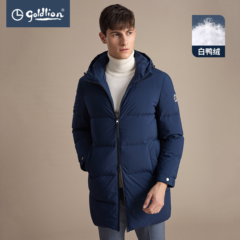 Jinlilai autumn and winter men thick warm double zipper pull lock down design fashion hood mid-length down jacket