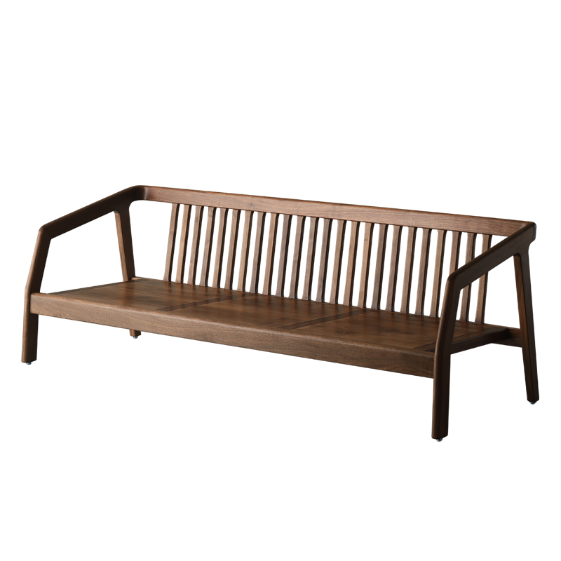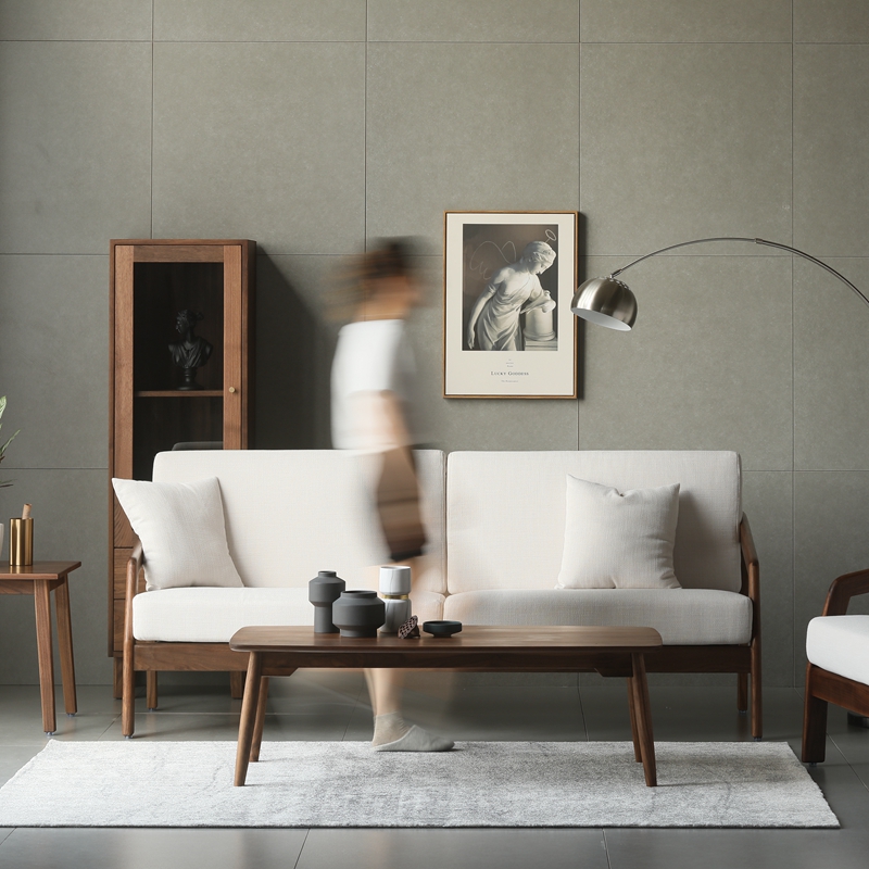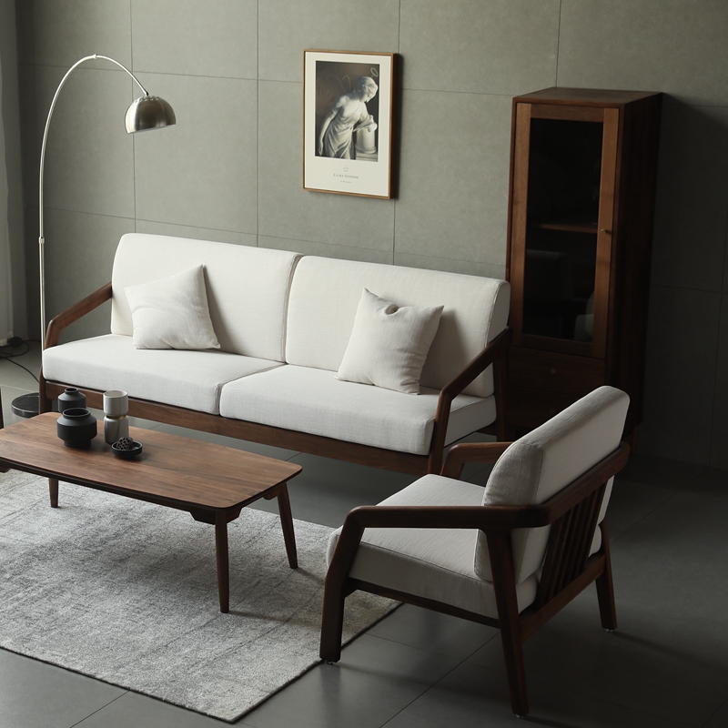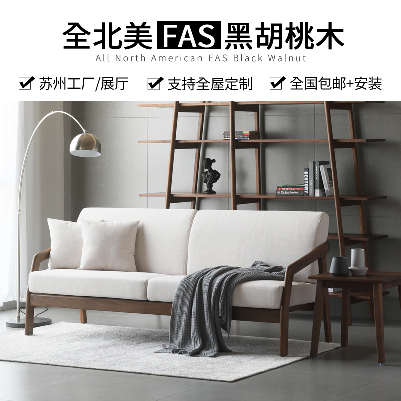 Nordic solid wood three-person sofa combination North American black walnut cloth art simple removable and washable small apartment tenon and mortise