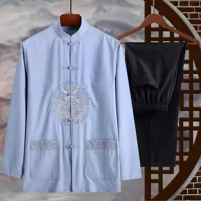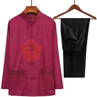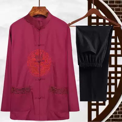 Elderly Tang suit men's long-sleeved suit Spring and autumn Chinese style grandpa suit Old man birthday birthday wedding silk clothes