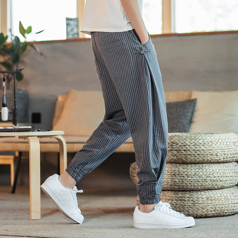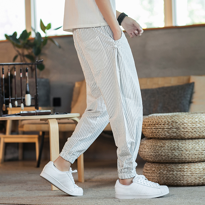 Chinese wind stripes trousers Boy tide thin dish button large size national tide beam pants small feet Tang and lamps pants