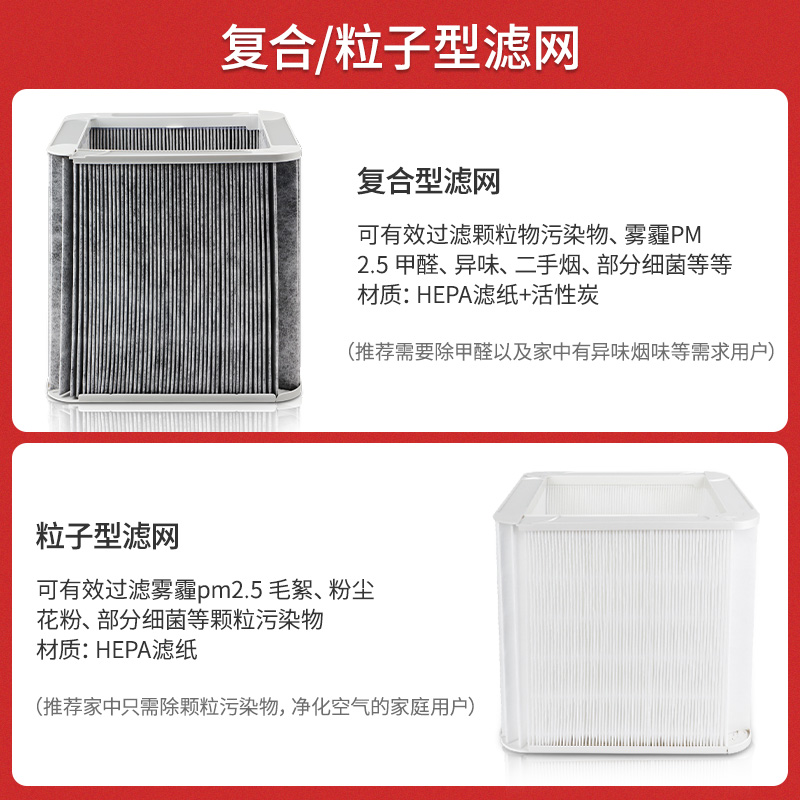 Composite type (removal of haze, aldehyde and odor) recommended Particle type (removal of haze and dust)