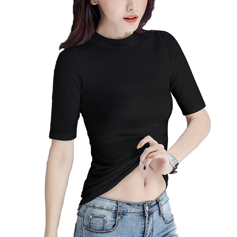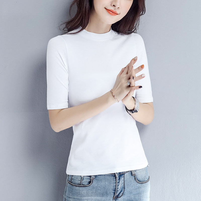 Half-high collar five-quarter-sleeve bottoming shirt women's summer dress pure cotton slim Korean version avocado green top black sleeve T-shirt