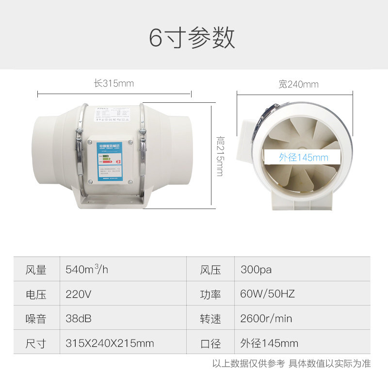 3 inches (pick up 75mm pipe) 4 inches (suitable for about 12 square left space) 6 inches (suitable for about 25 square left space) 8 inches (suitable for 45 horizontal left and right space) 10 inches (suitable for