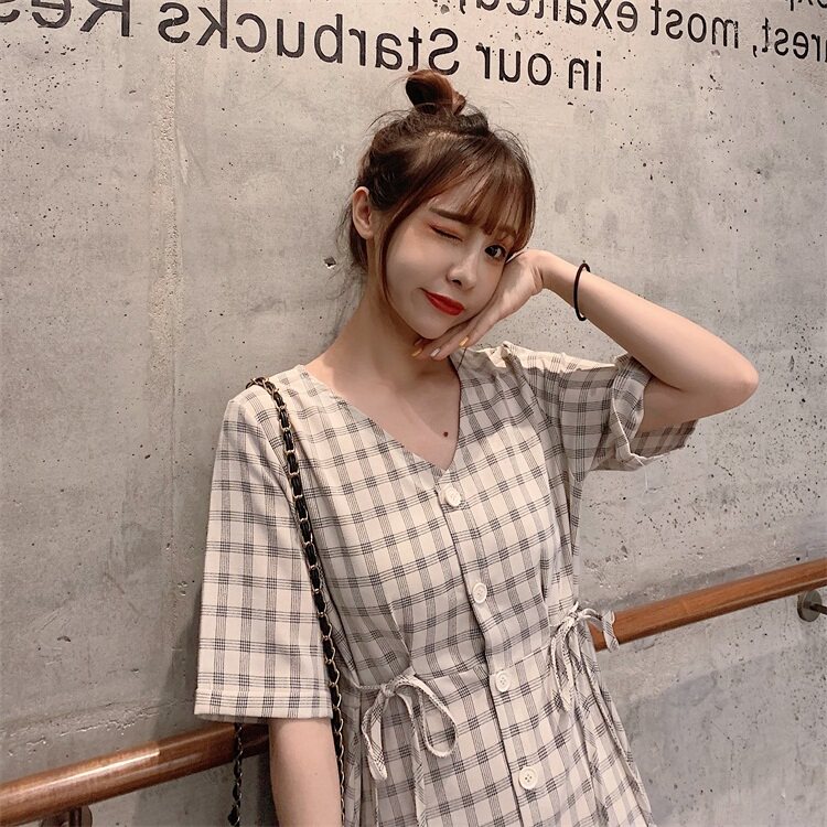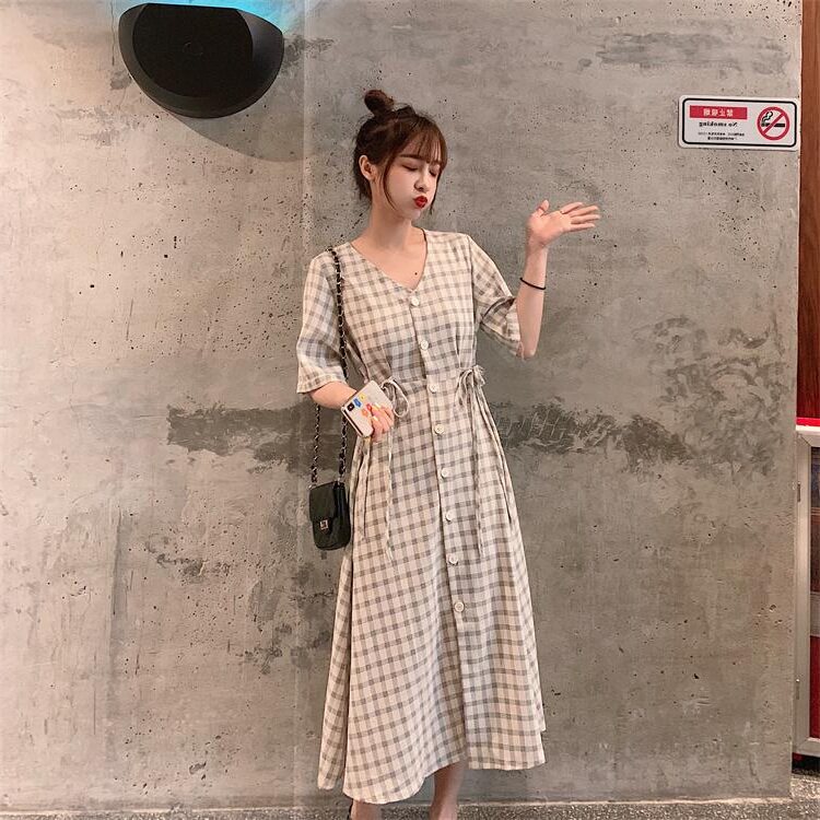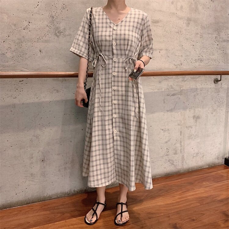Fa-style retro V collar plaid slim fit waist display slim and small fresh temperament long version fairy shirt Long dress Summer
