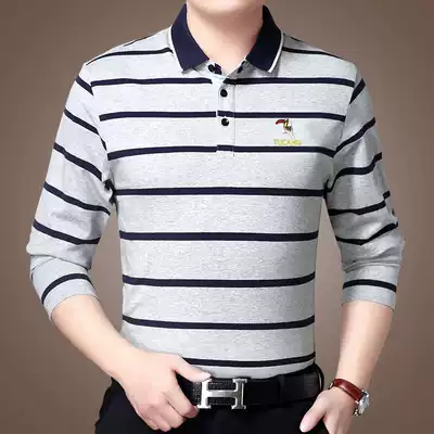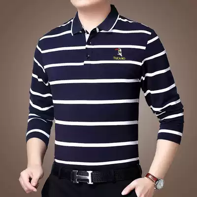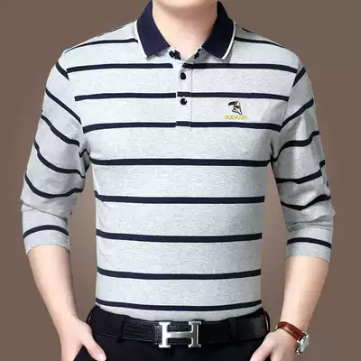 Woodpecker spring and autumn pure cotton long-sleeved t-shirt men's lapel loose casual middle-aged father striped polo shirt
