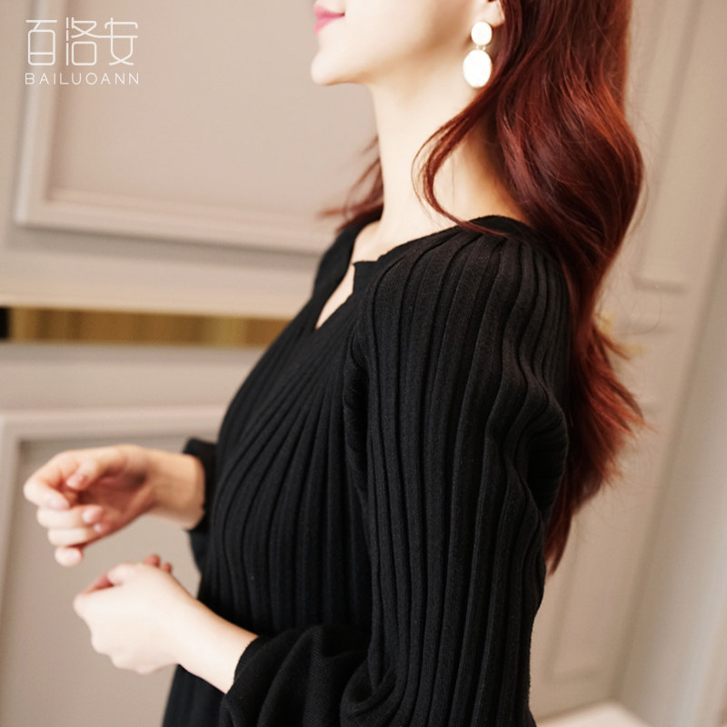 100 Loanlong Version Over Knee Knit Foreign Dress Women's New Lantern Sleeves Caution Machine Sweater Dress Loose Neater Skirt