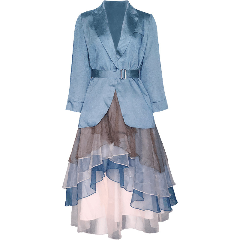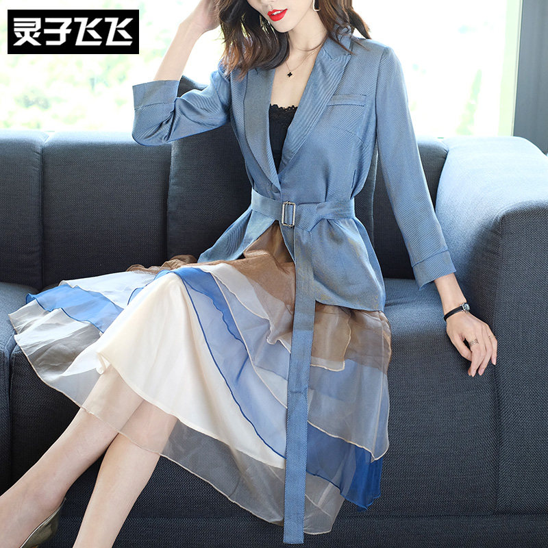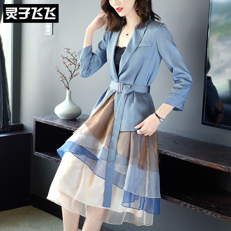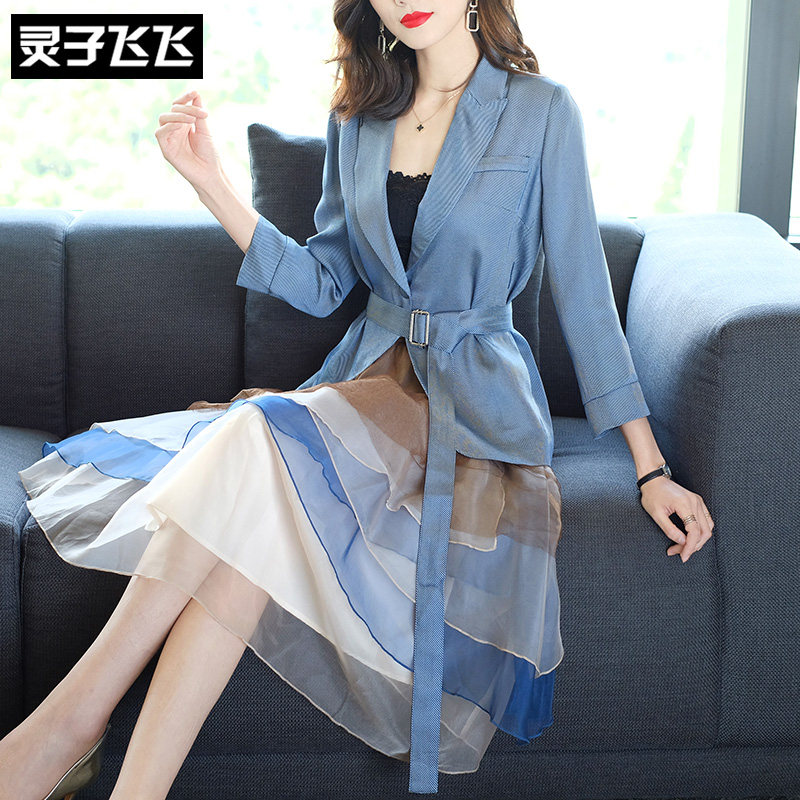 2019 autumn new style light cooked style mid-length long-sleeved waist suit collar suit organza dress two-piece set