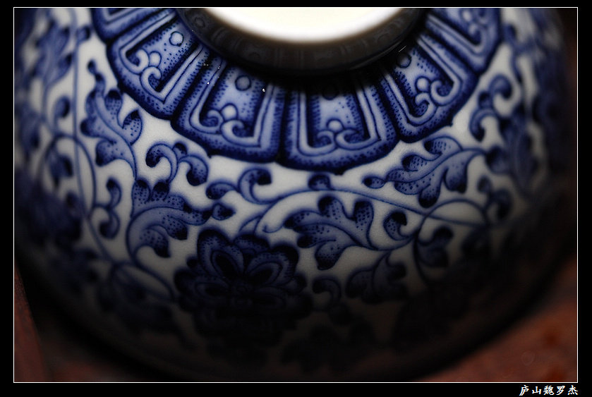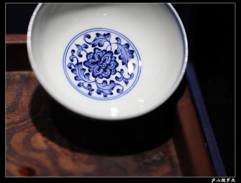Qingfu bottom model Jingdezhen firewood kiln firing heavy industry underglaze blue and white dot work wrapped branch lotus inner painting circle foot cup hand-painted