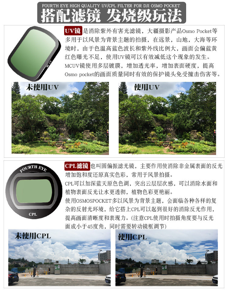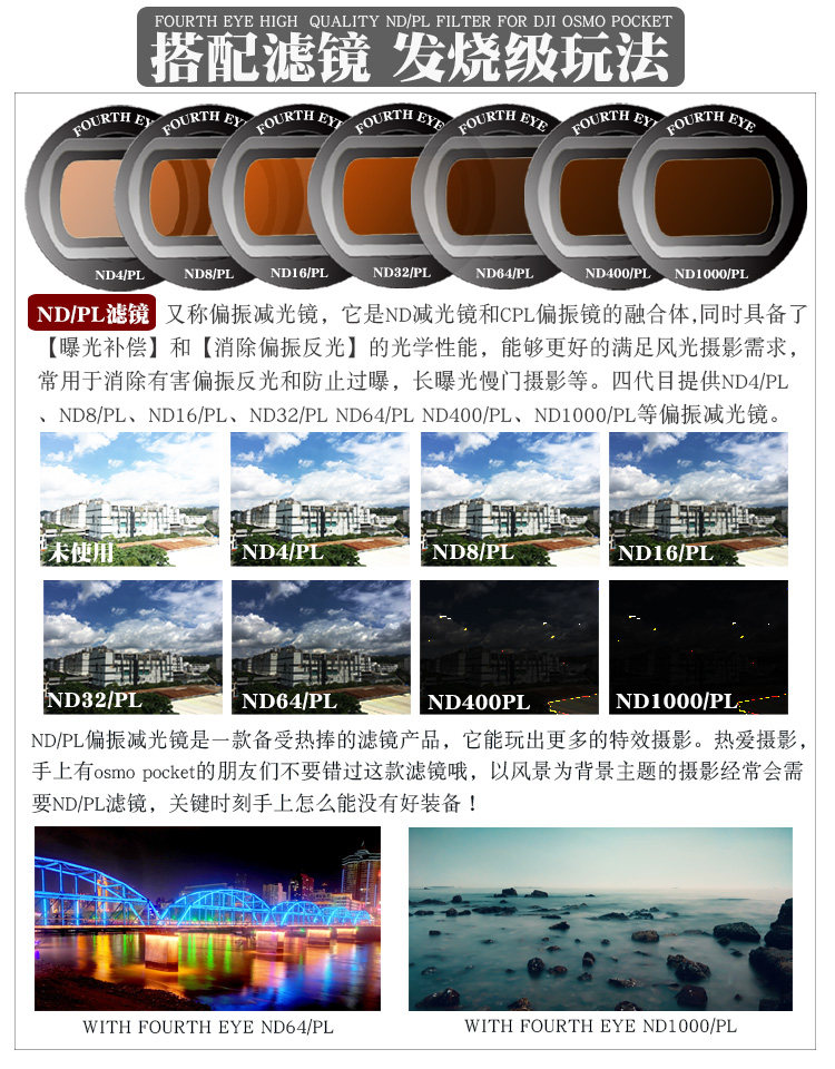 HD UV mirror CPL polarizer (plus saturation de-reflection)ND4 (glass lens minus 2-speed light) ND8(glass lens minus 3-speed light) ND16(Glass lens minus 4-speed light)