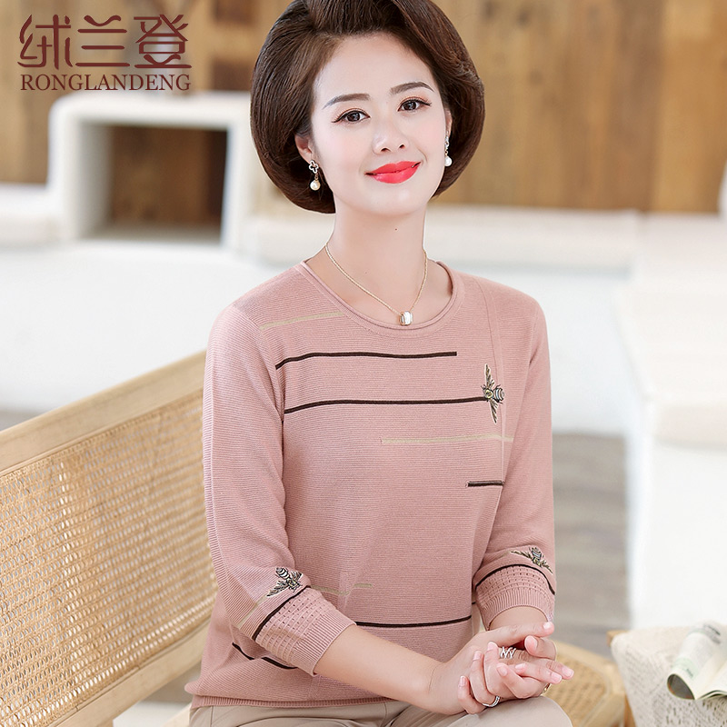 Middle Aged Female Mom Spring Autumn Clothing 2022 New Middle Aged T-shirt Mid-Aged T-shirt 50-Year-Old Foreign Pie Knitwear Knitwear