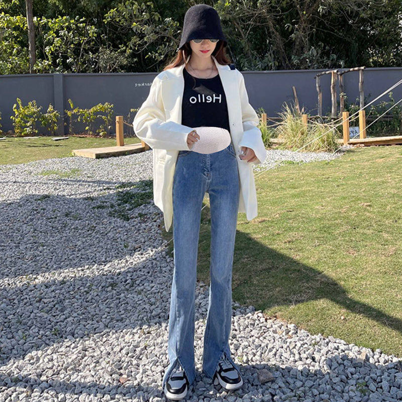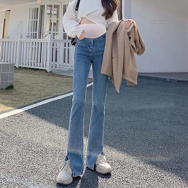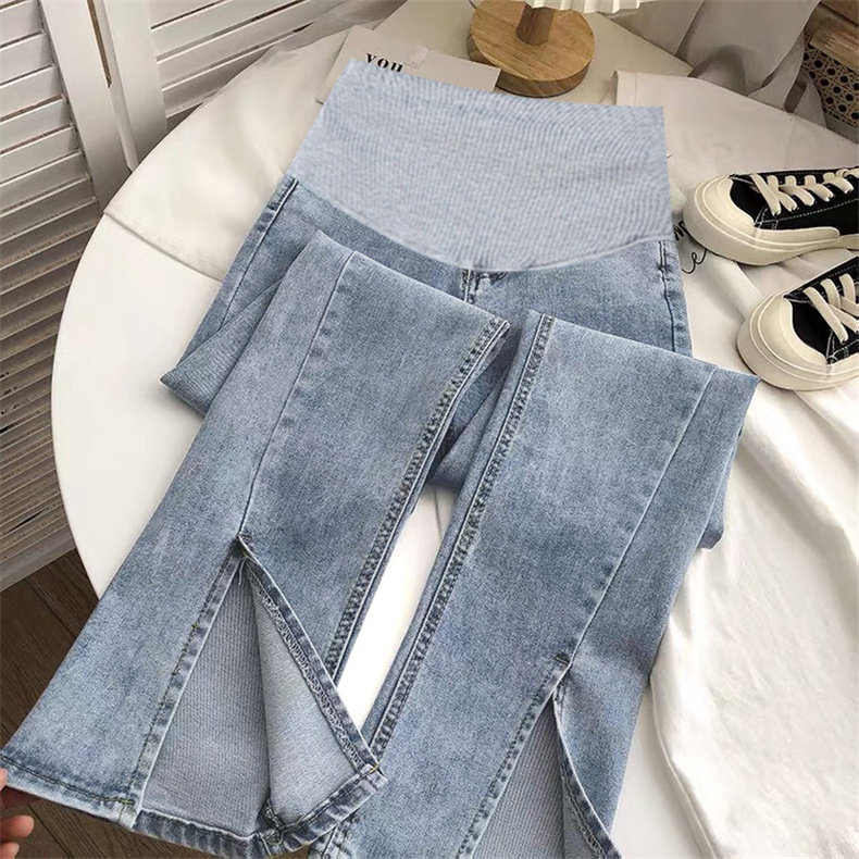 Pregnant woman pants spring and autumn outside wearing open fork long pants straight cylinder wide leg horn denim jeans child care spring dress new thin section