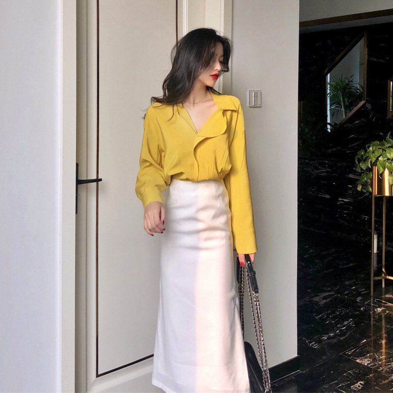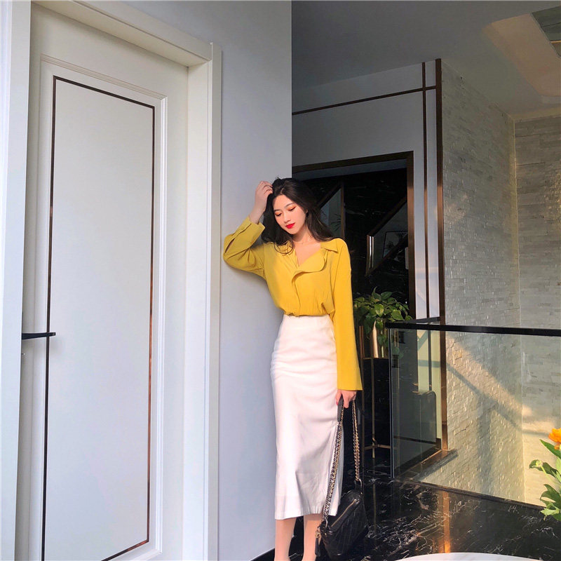 Apricot shirt dark green skirt