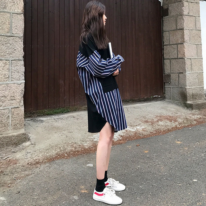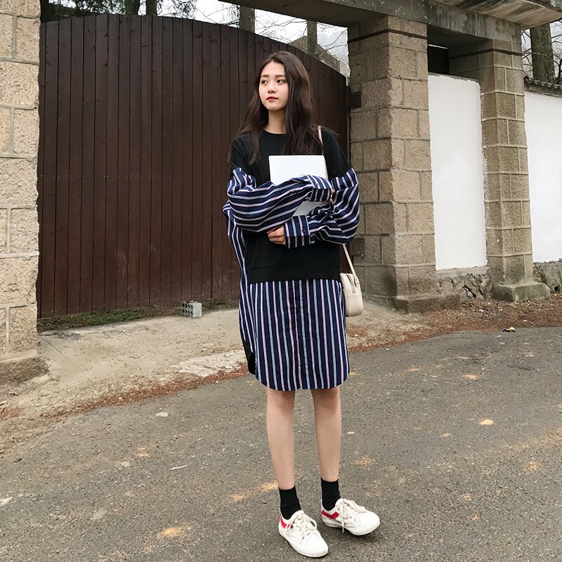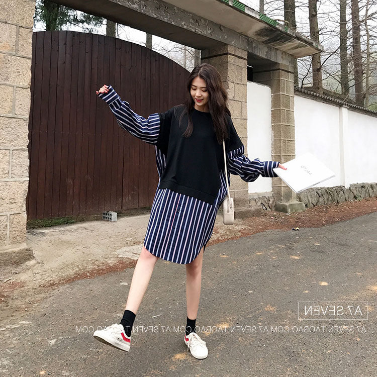 Pregnant women's spring and autumn suit dress fashion Korean striped slim medium and long shirt tide mom sweater two-piece suit