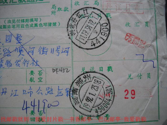 Remittance slip cover code stamp DF452 Hebei Danjiangkou · 441900, next crescent 2, word nail inverted