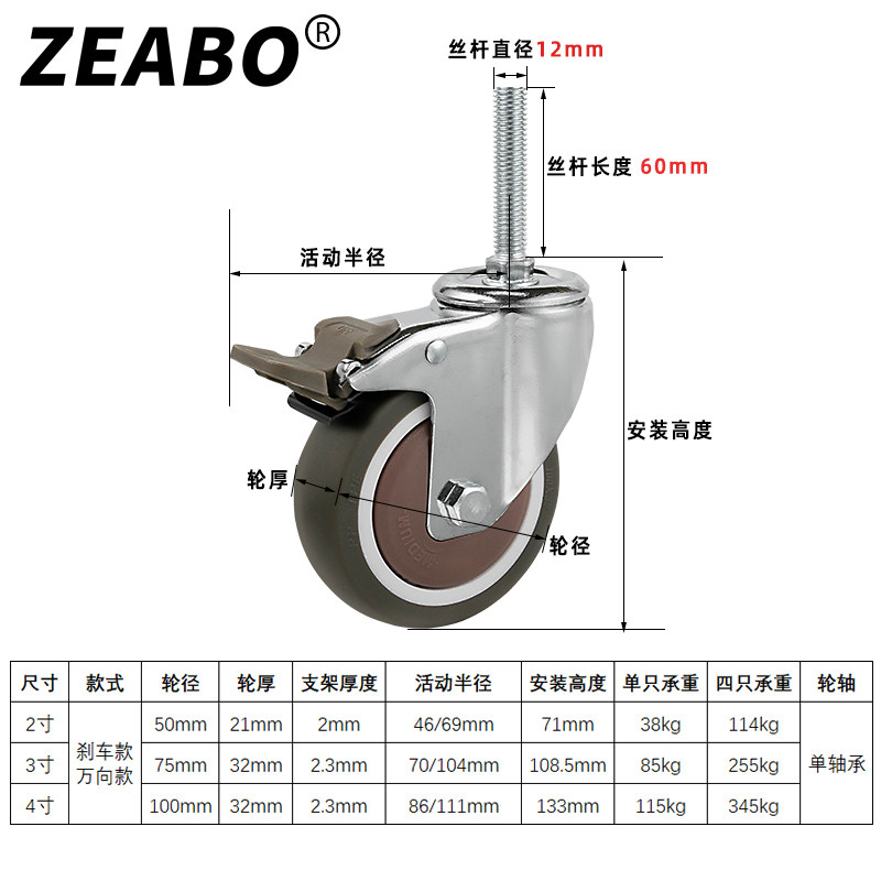 2-inch universal 2-inch brake 3-inch universal 3-inch brake 4-inch universal 4-inch brake 4-inch polyurethane universal wheel (M12*60)