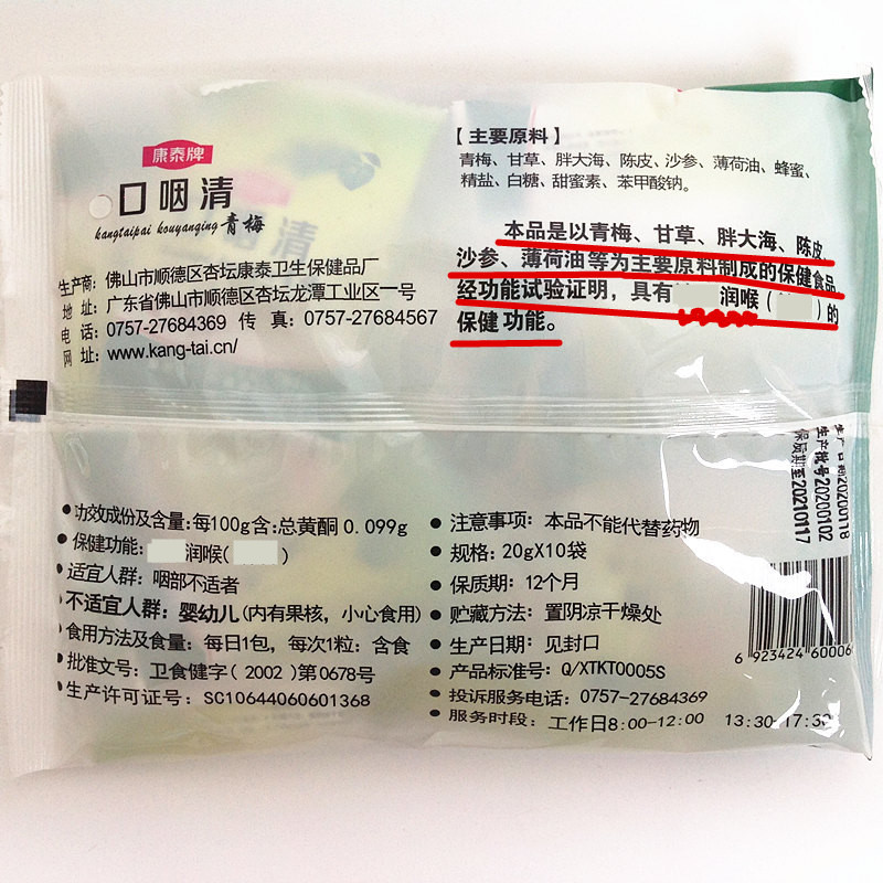 Green plum, licorice, fat sea, tangerine peel, ginseng oil, honey, refined salt, sugar