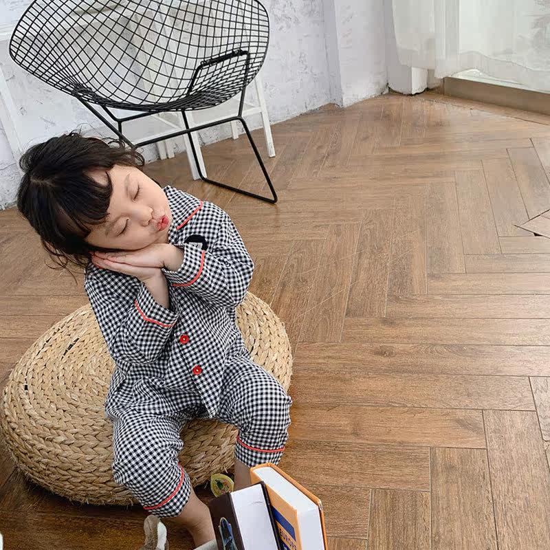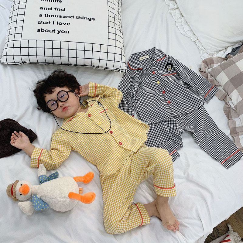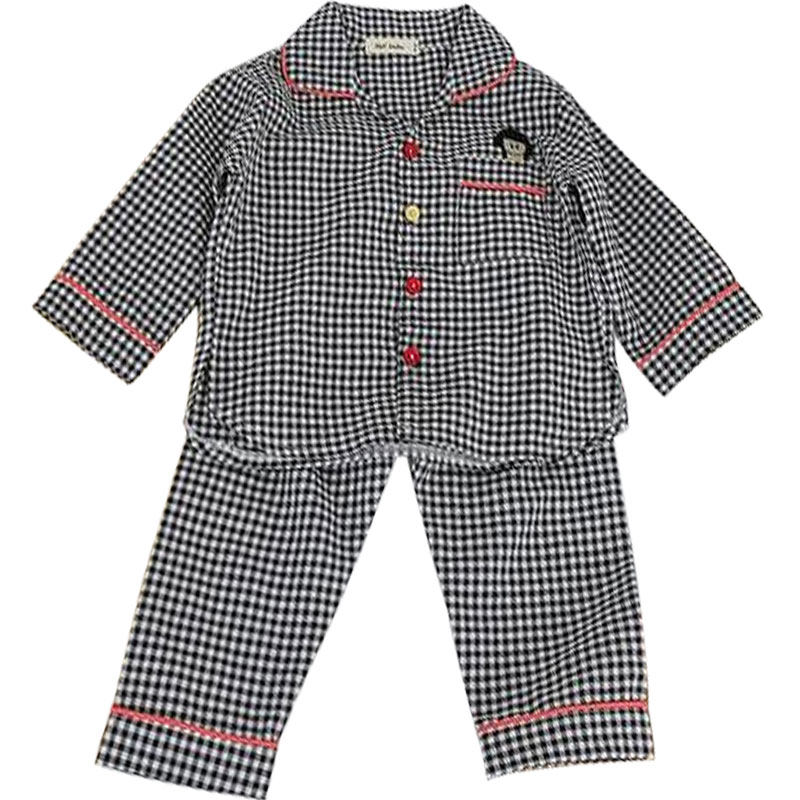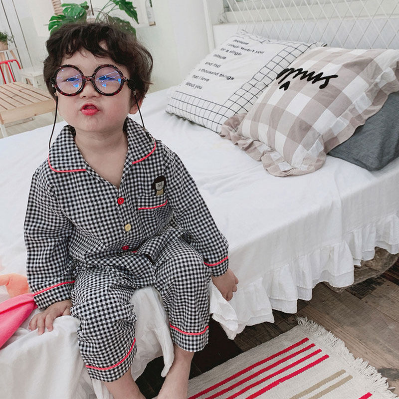 Children's plaid home clothes Spring and Autumn girls neutral pajamas set thin Korean version of the baby cotton long-sleeved air conditioning clothes