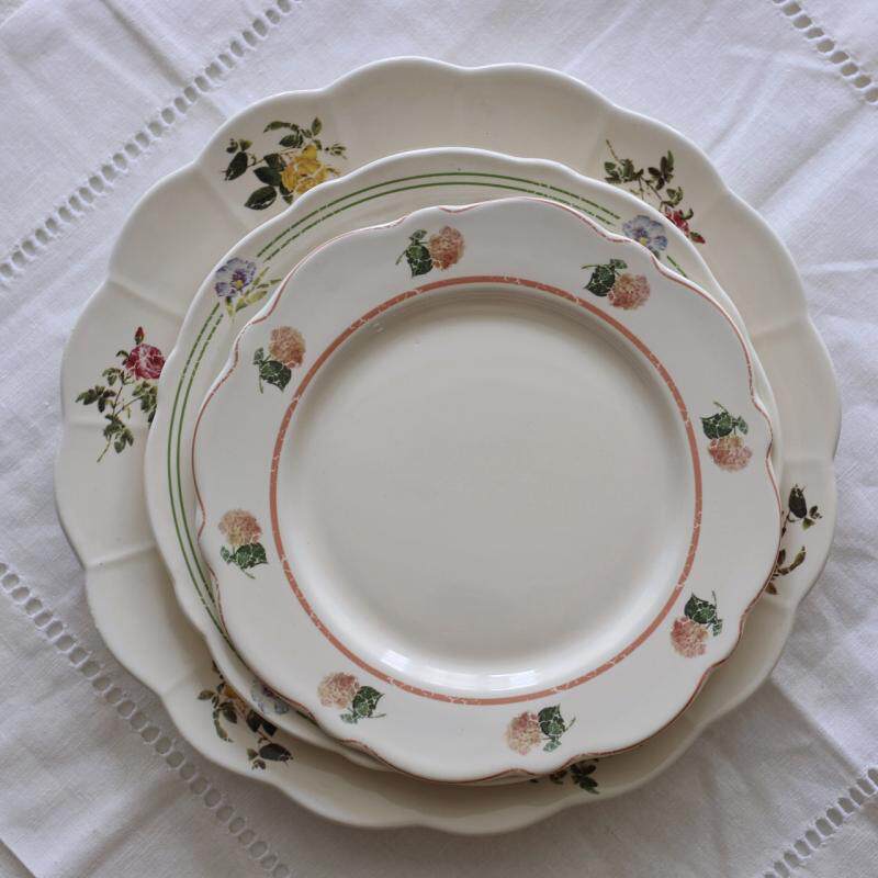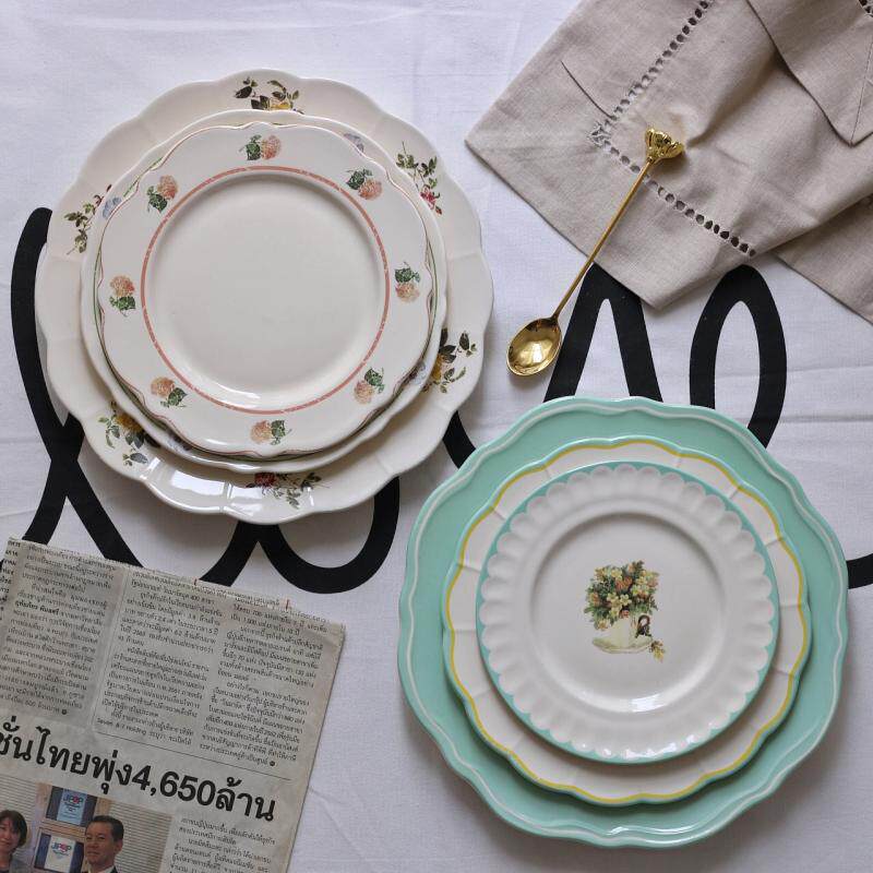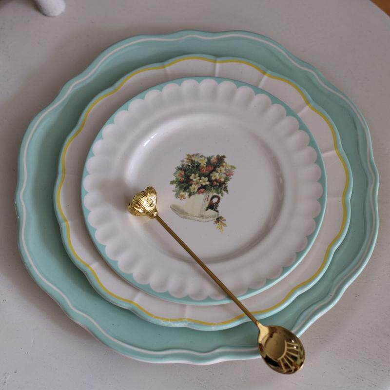 Mint green side dish with flower 16 cm pan side small rose 18 cm pan side double line strips small flowers 20 cm lemon yellow side dish with 20 cm pan large rose flowers 25 cm mint green broadside dish