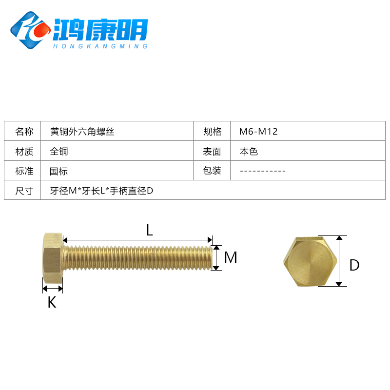 Brass outer hexagonal screw outer hexagonal bolt copper screw connection electrode locking all copper products M6M8M10M12
