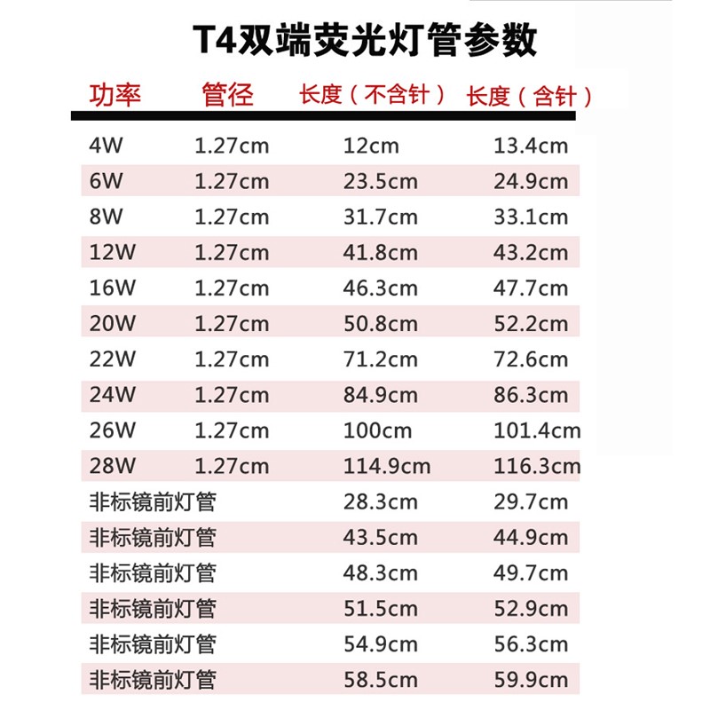 T4 6W (23.5CM without needle) 2pcs T4 8W (without needle 31.7CM) 2pcs T4 12W (without 41.8CM without needles) 2pcs T4 16W (46.3CM without needles) 2 t4 20W (without 50.8CM.5cm without needles) 2pcs T4 22W (without needle 71.2CM) 5 t4 24W (without 84.9cm without needles) 5 t4 26W (without quantum needles 100cm) 5 t4 28W (without measuring needles 114.9CM) 5 t4 non-standard (28.3CM without a needle) 2 t4 non-standard 20W (no needle 43.5CM) 2 t4 non-standard 20W (no needle 48.3CM) 2 t4 non-standard 20W (no needle 51.5CM) 2 t4 non-standard 20W (no needle 54.9CM) 2 t4 non-standard 20W (no needle 58.5CM) 2 T5 8W (28..8CM without a needle) 2 T5 14W (54.9CM without a needle) 2 T5 18W (71.3CM without needle) 5 t5 21W (84.9cm without needle) 5 T5 24W26W (100cm without needle) 5 T5 28W (114.9CM without needle) 5