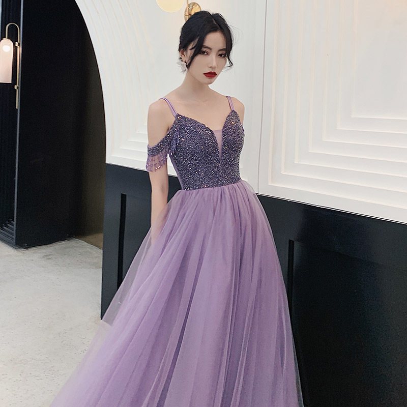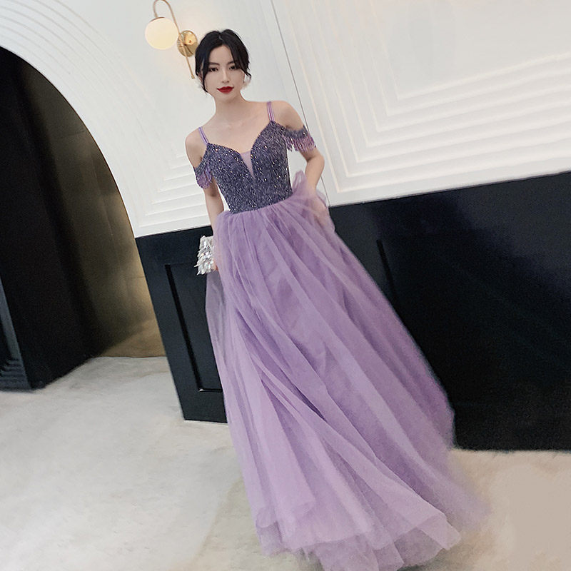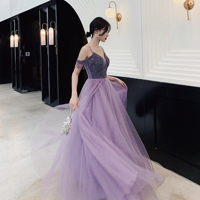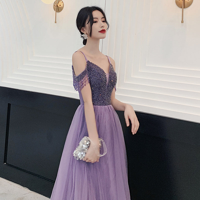 Evening dress women's 2020 new temperament toast clothing heavy industry banquet annual meeting dress skirt fairy dreamy word shoulder purple