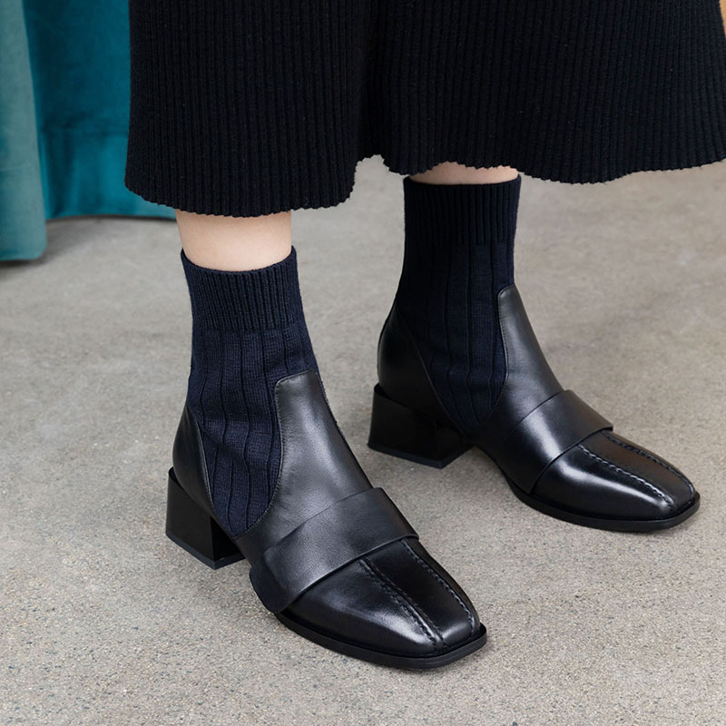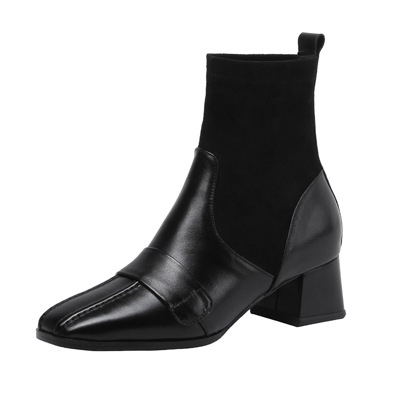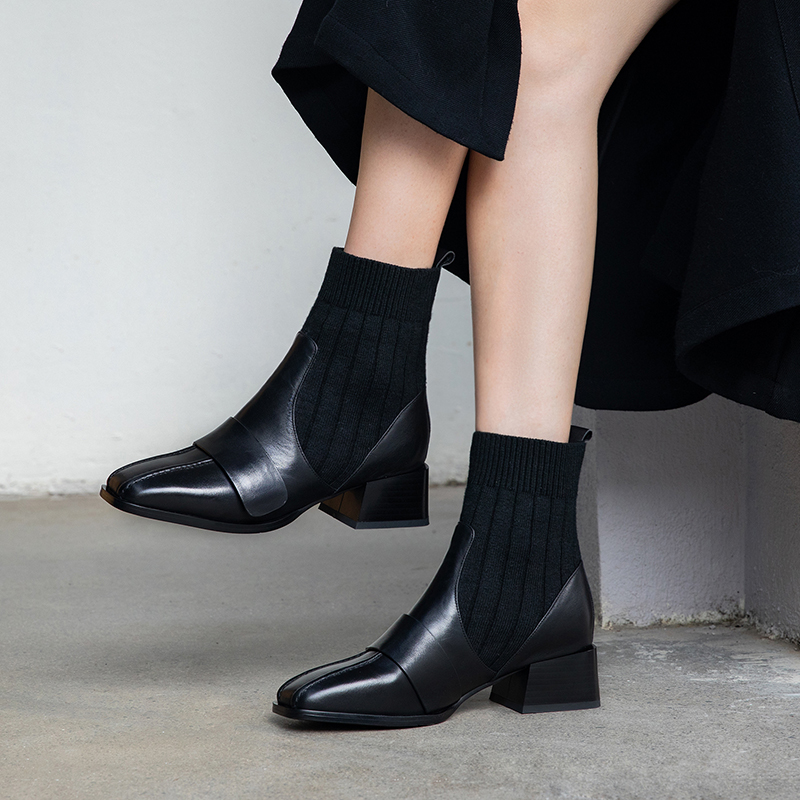 Cat lord homemade Inn Wind crude heel Martin boots Women 2023 Autumn winter new black genuine leather elastic knit short boots-Taobao