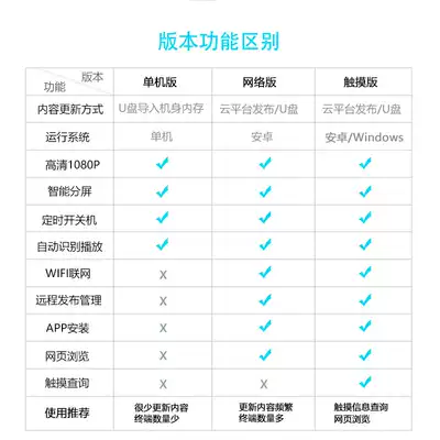32-inch wall-mounted stand-alone version 32-inch wall-mounted network version 32-inch wall-mounted Android touch version 43-inch vertical stand-alone version 43-inch vertical network version 43-inch vertical Android touch version 43-inch wall-mounted stand-alone version