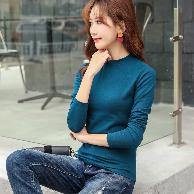 Long sleeve T-shirt woman fit 2020 new half-height collar with medium long version pure cotton peacock blue blouses tights