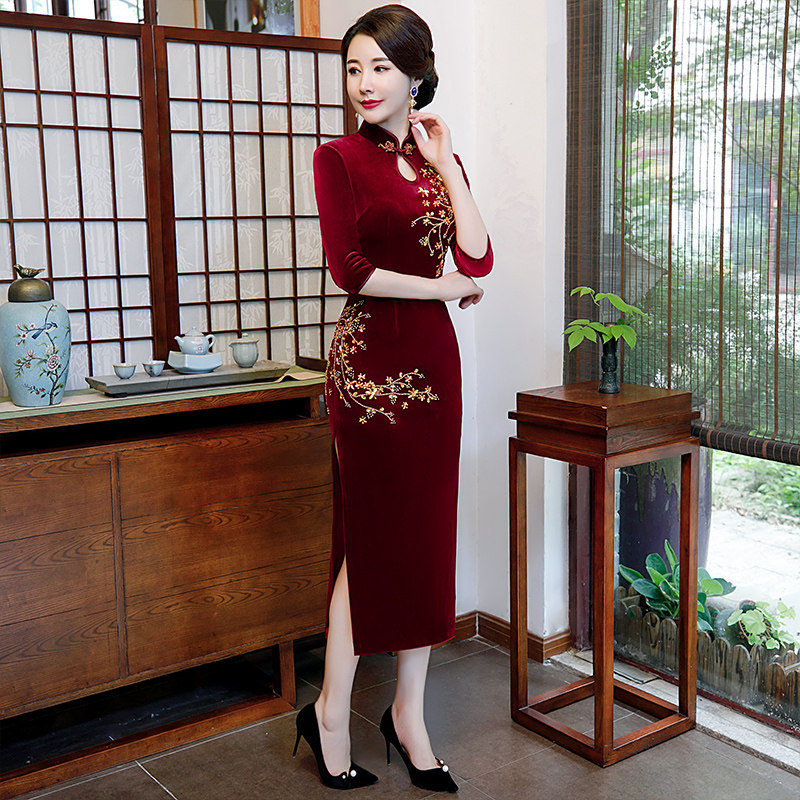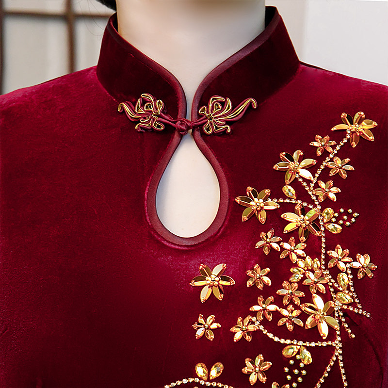 Gold velvet cheongsam dress 2022 new autumn and winter plus velvet thick mid-length noble mother dress wedding catwalk dress