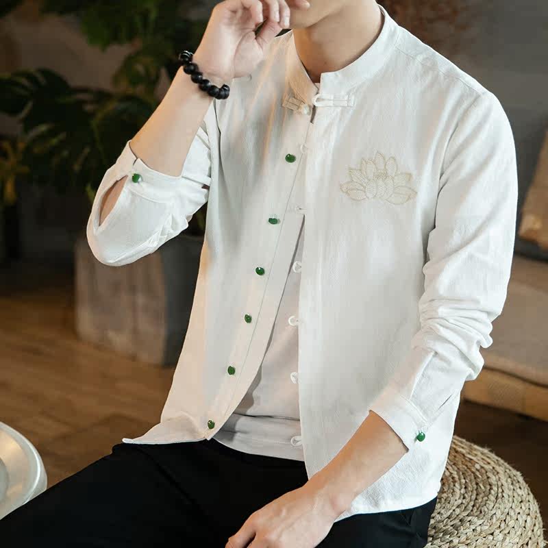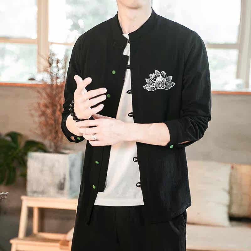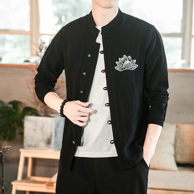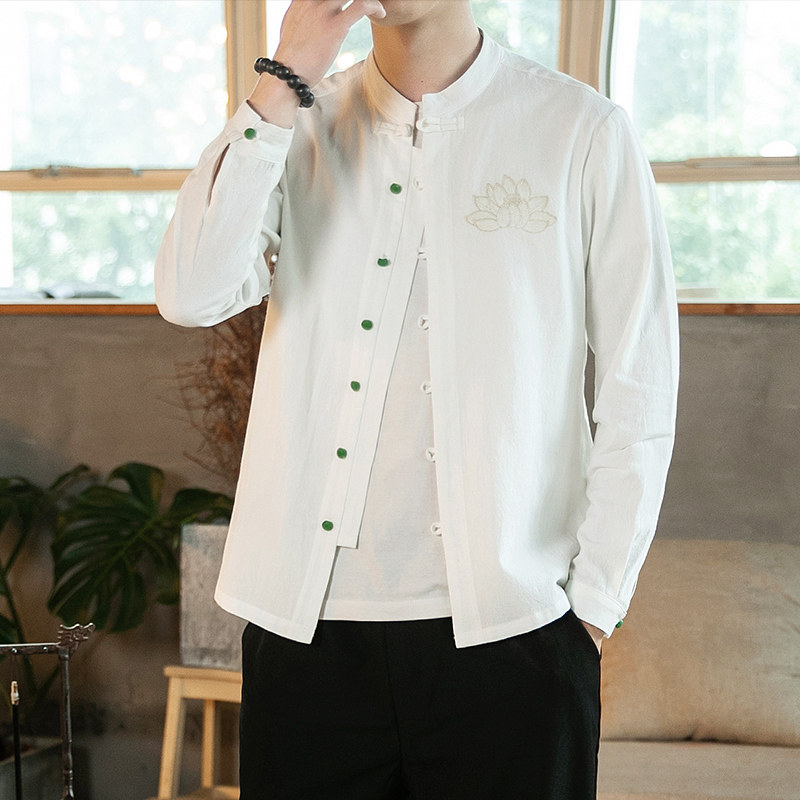 Autumn linen shirt men's China split retro long sleeve large size inch shirt youth loose embroidered Tang gown