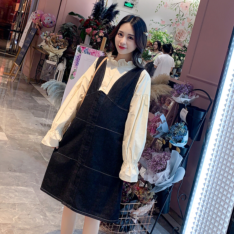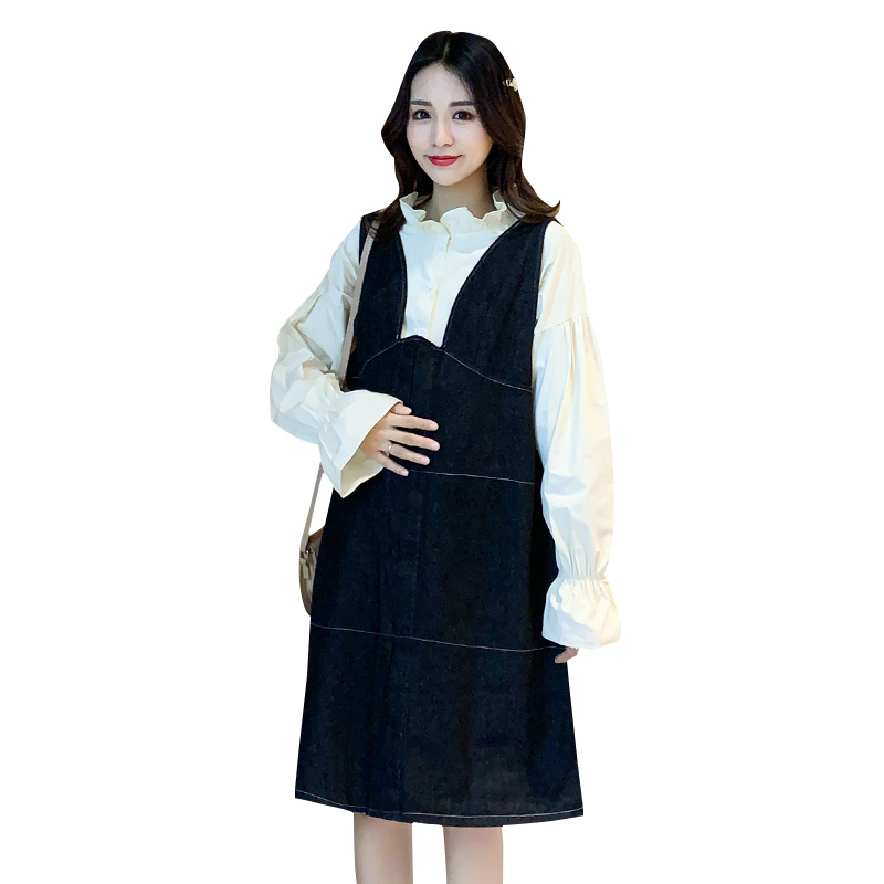 Pregnant women in early autumn new loose age reduction thin two-piece dress long-sleeved shirt denim sundress suit tide