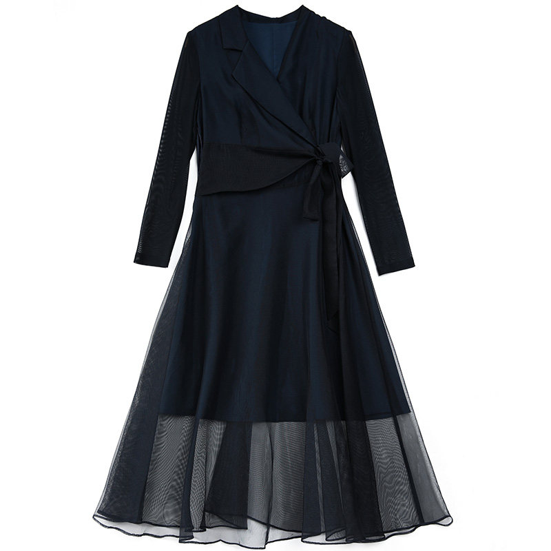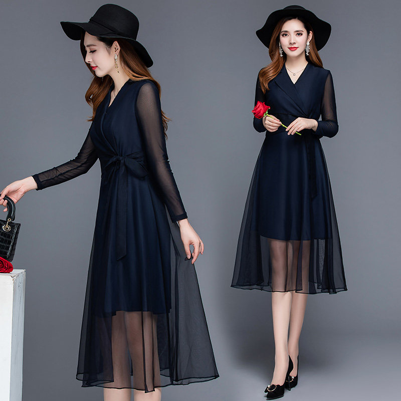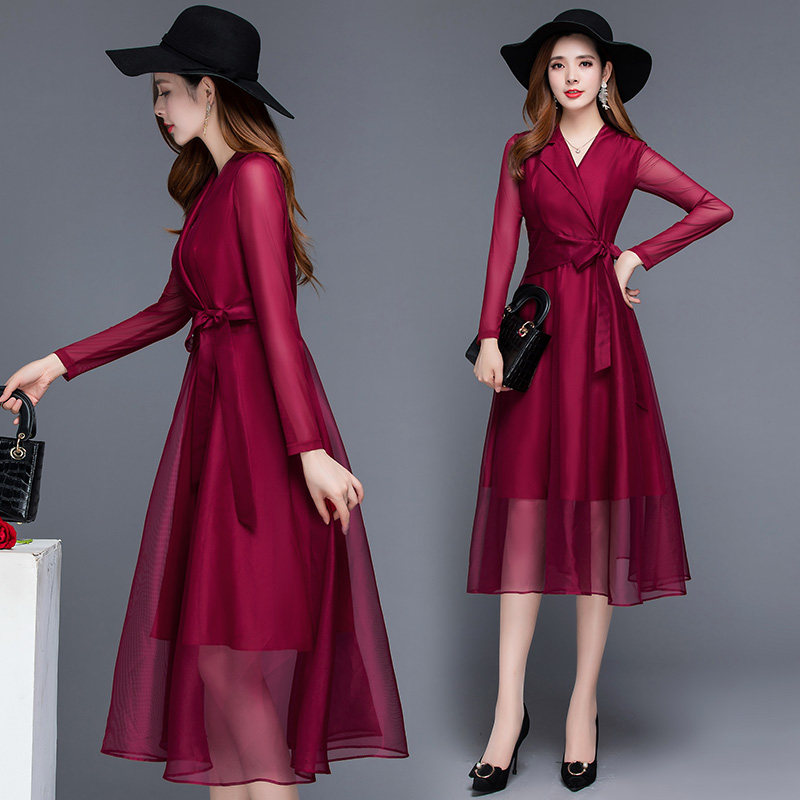 Long-sleeved dress autumn 2021 new V-neck temperament high-end thin mesh over the knee spring and autumn red skirt