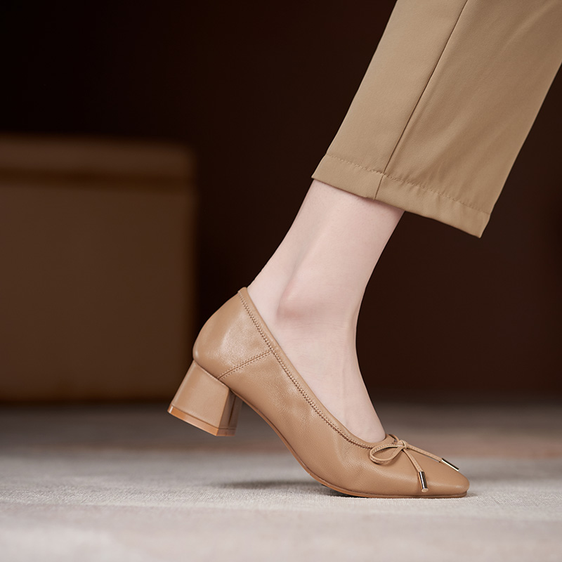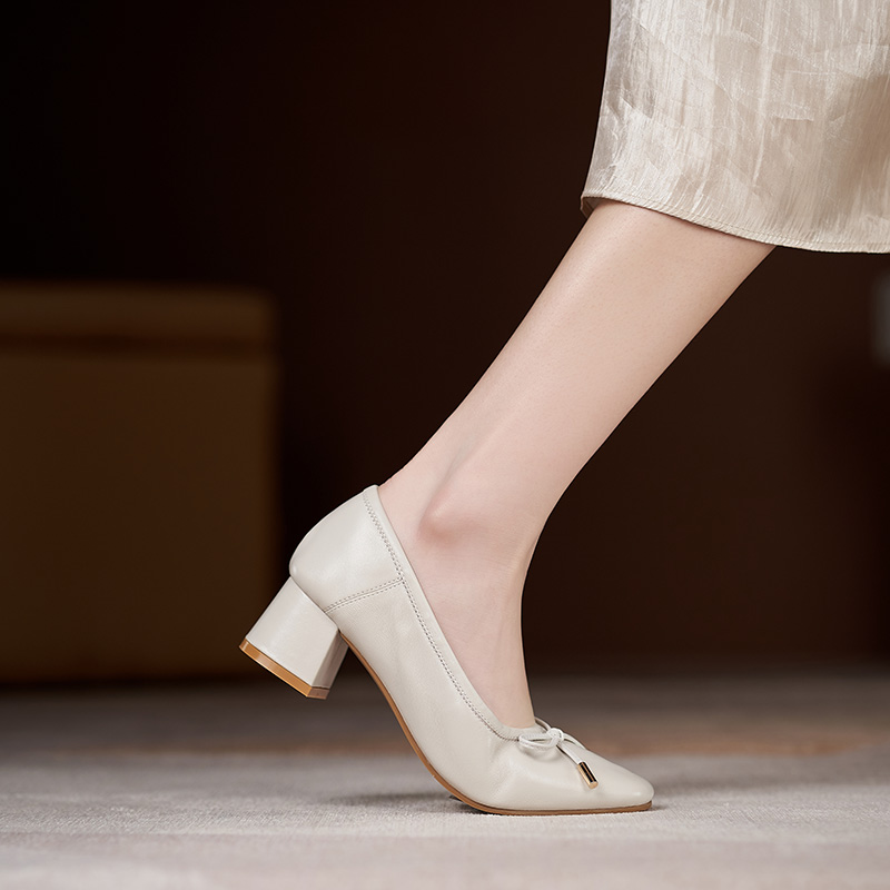 4 5cm soft leather grandma shoes spring thick heel women's single shoes retro small size genuine leather shallow mouth square toe middle heel bow