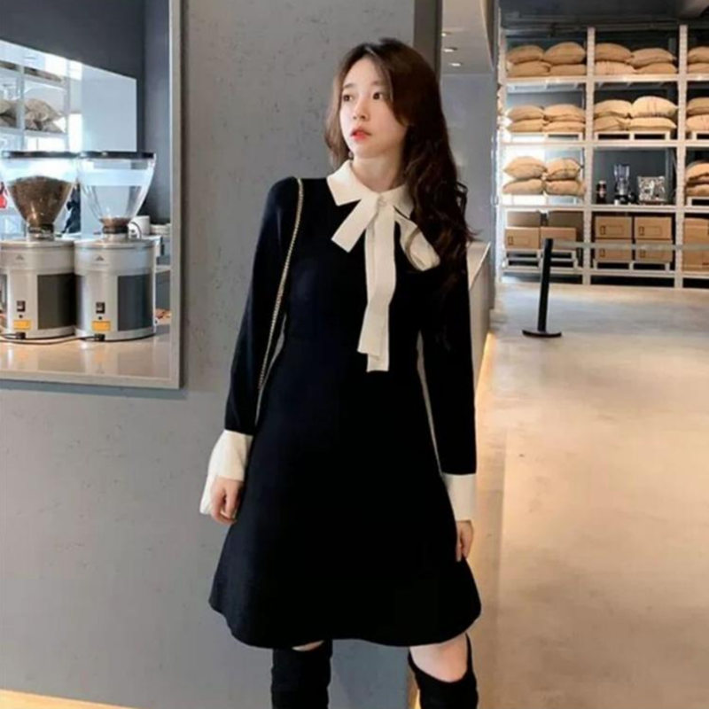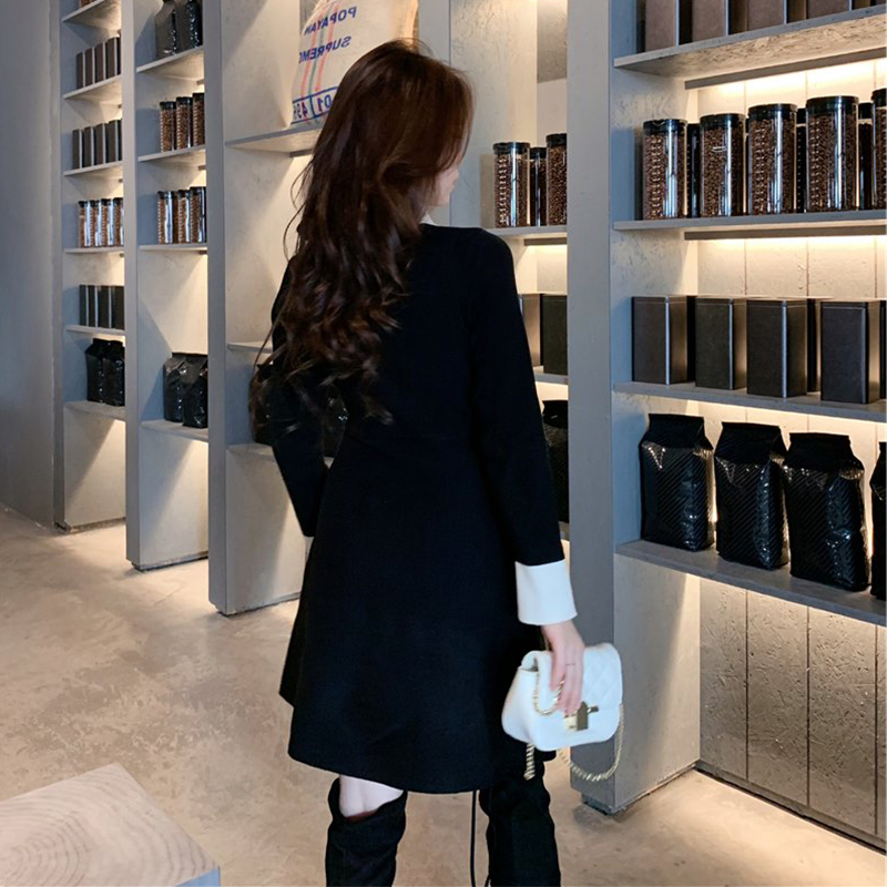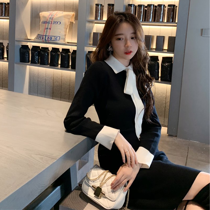 Autumn Winter Doll Collar Machine Herben Black Knit Foreign Dress Style Super Fairy High Waist Inner Hitch Base Sweater Dress
