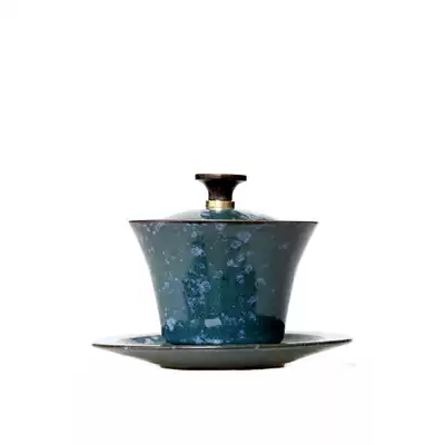 The rough pottery kiln becomes blue sky, the big number of the tea cup, the three talents, the tea, the ceramic tea bowl.