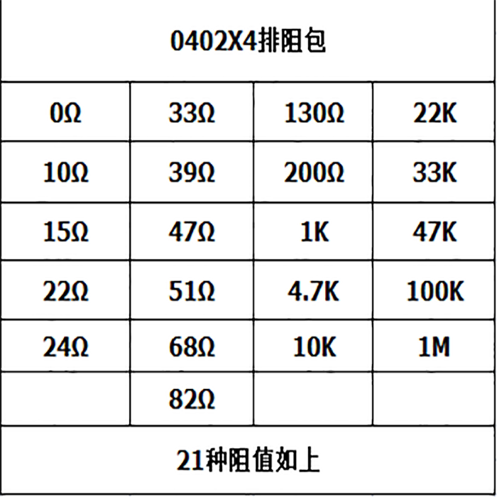 Patch drain resistor elements hybrid pack 0402X4 8P4R foot common 17 varieties of 50 total of 800 only rows of 50