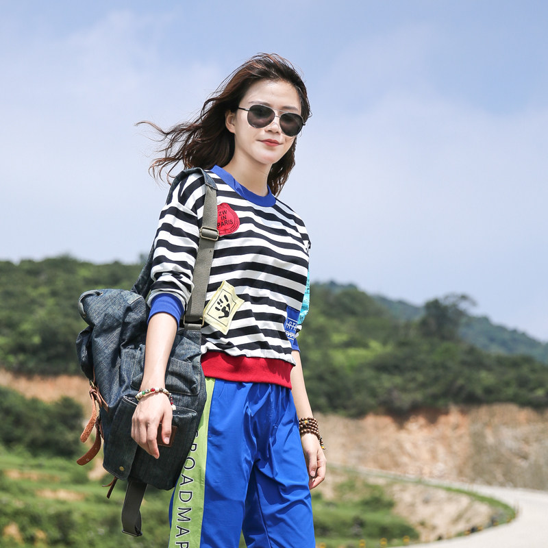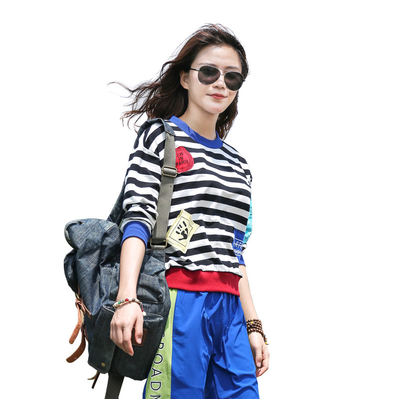 Outdoor cotton striped long sleeve t-shirt women travel street beggar patch tide brand crew neck pull over loose sweatshirt woman