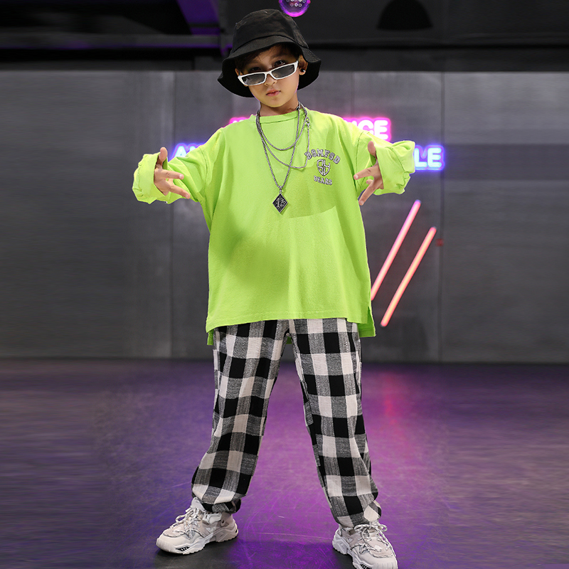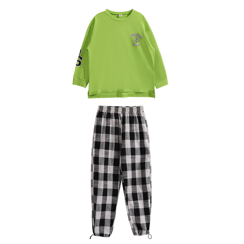 Letter printed long sleeve T-shirt fluorescent green letter printed long sleeve T-shirt rice white letter printed long sleeve T-shirt orange letters printed long sleeve T-shirt black black and white plaid pants letter printed long sleeve T