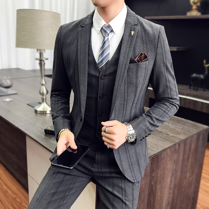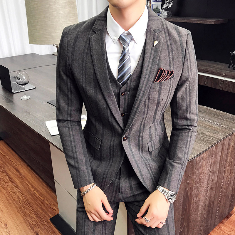2019 autumn new men's suits business casual suits Korean version of the slim wedding three-piece striped dress trend