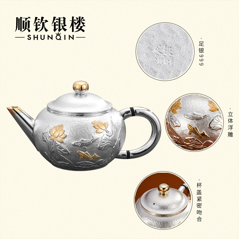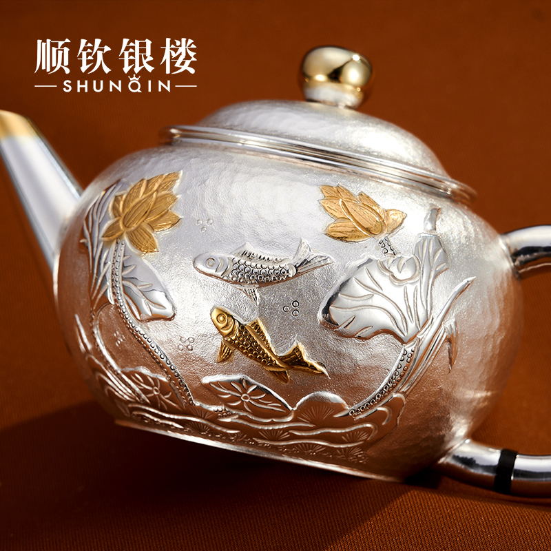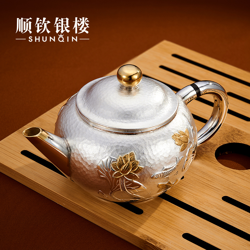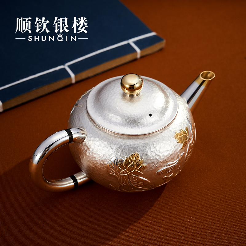 Shunqin Silver Building 999 Foot Silver Gold Plated Lotus Tea Tea Tea Tea Tea Bubble Teapot Pure Silver Kung Fu Pot Collection Gift and Courtesy Swing