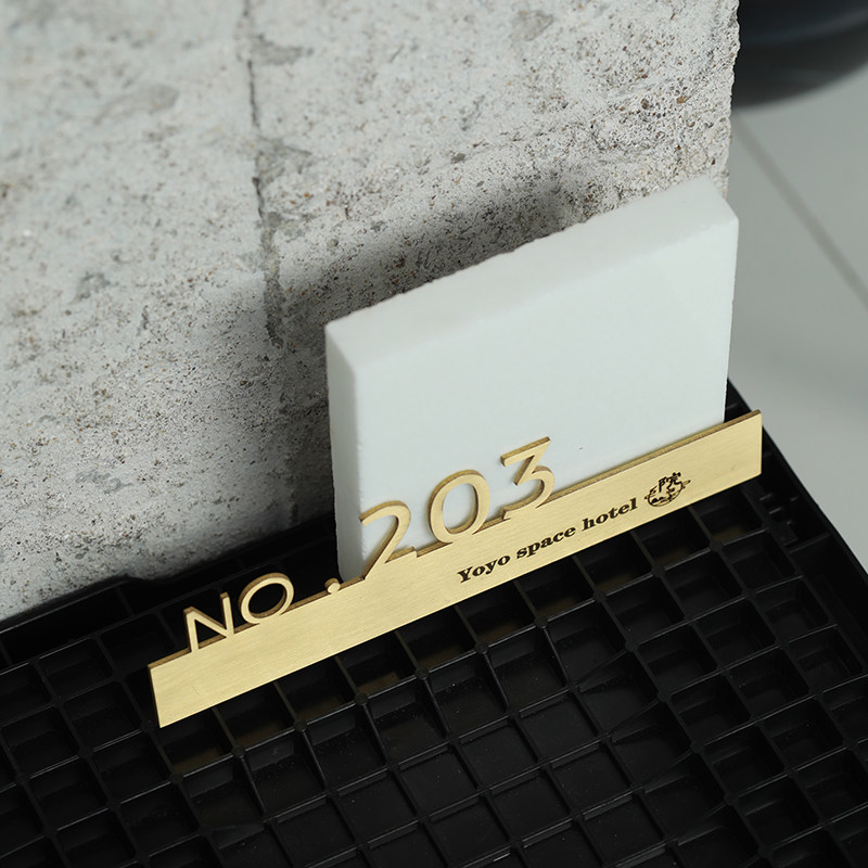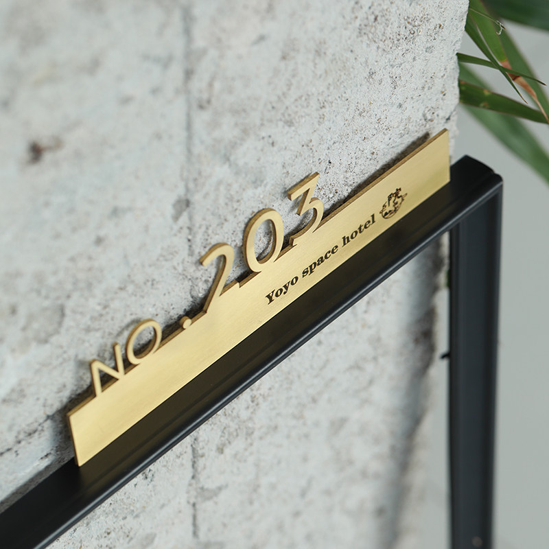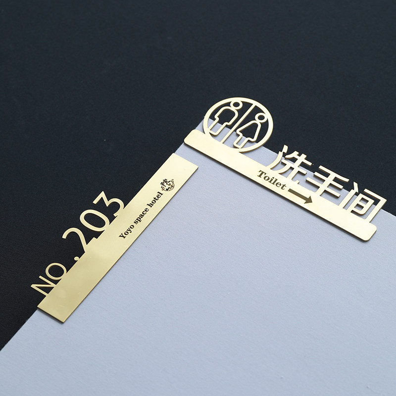 Doorplate number (lower single note) presented with liquid nail door card digital lettering (lower single note) Bathroom Logo Presented with liquid nail washroom logo engraved (lower single note)