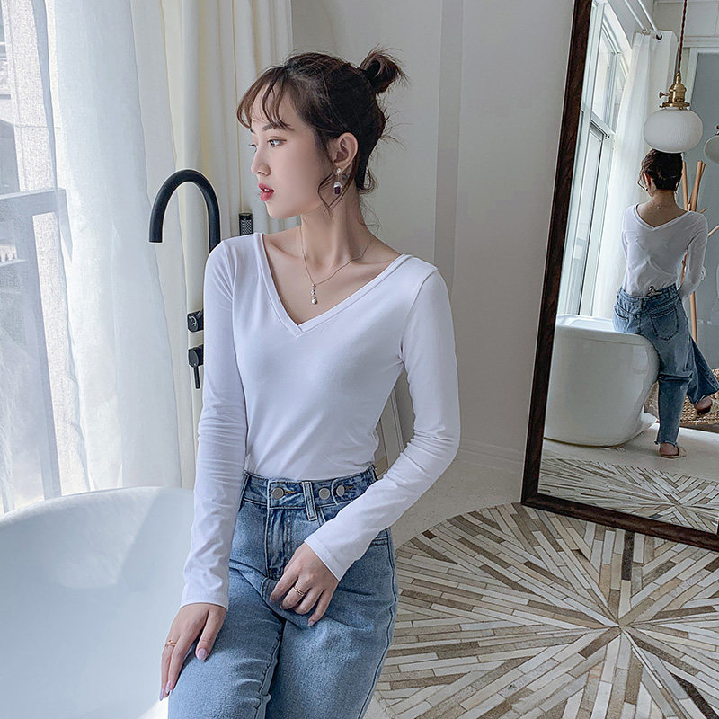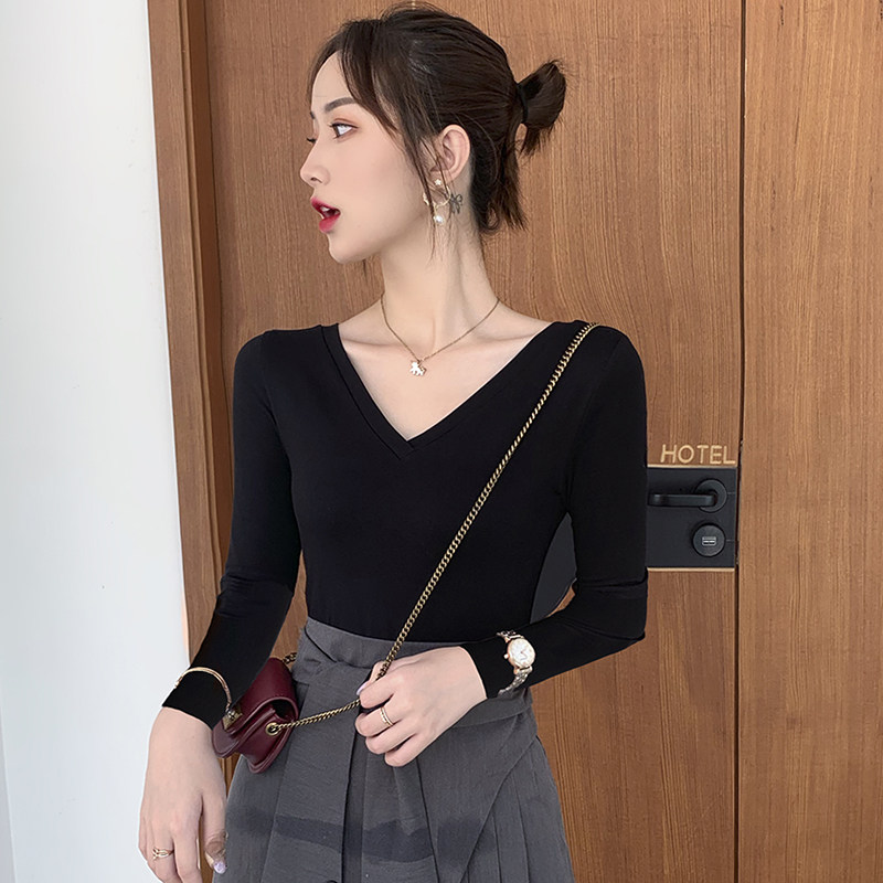 Long-sleeved T-shirt women's v-neck bottoming shirt slim double V-neck autumn and winter large neckline slimming solid-color tops for inner wear and outer wear