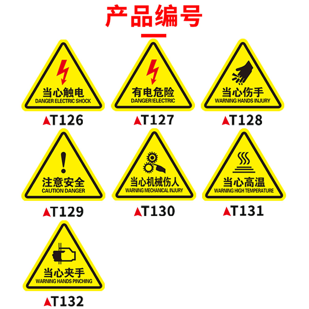 T126 Beware of electric shock(one) T127 is electrical danger (one) T128 Beware of the injury hands (one) T129 pay attention to safety(one) T130 careful mechanics