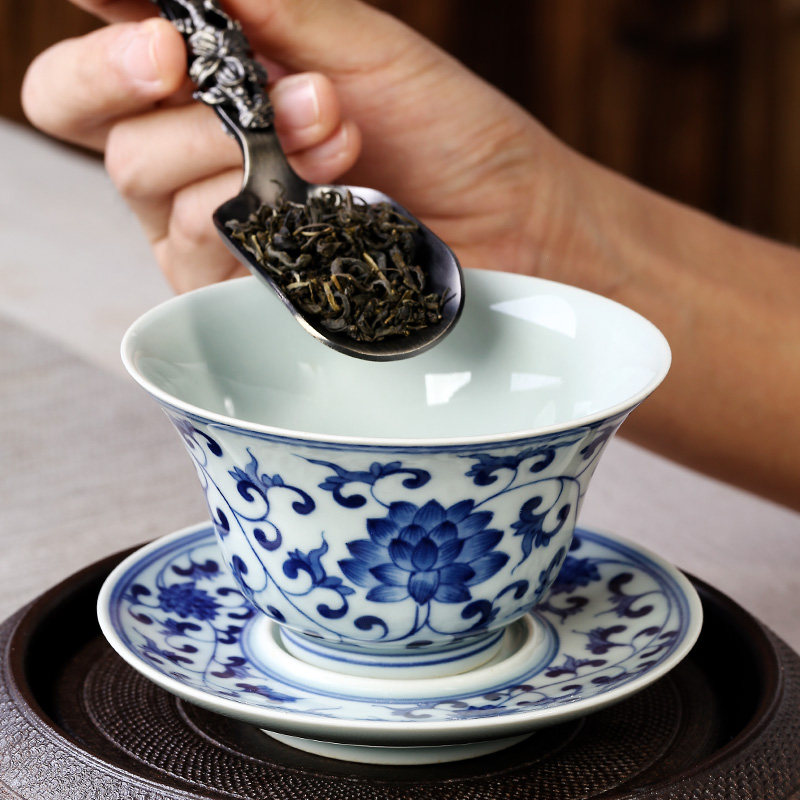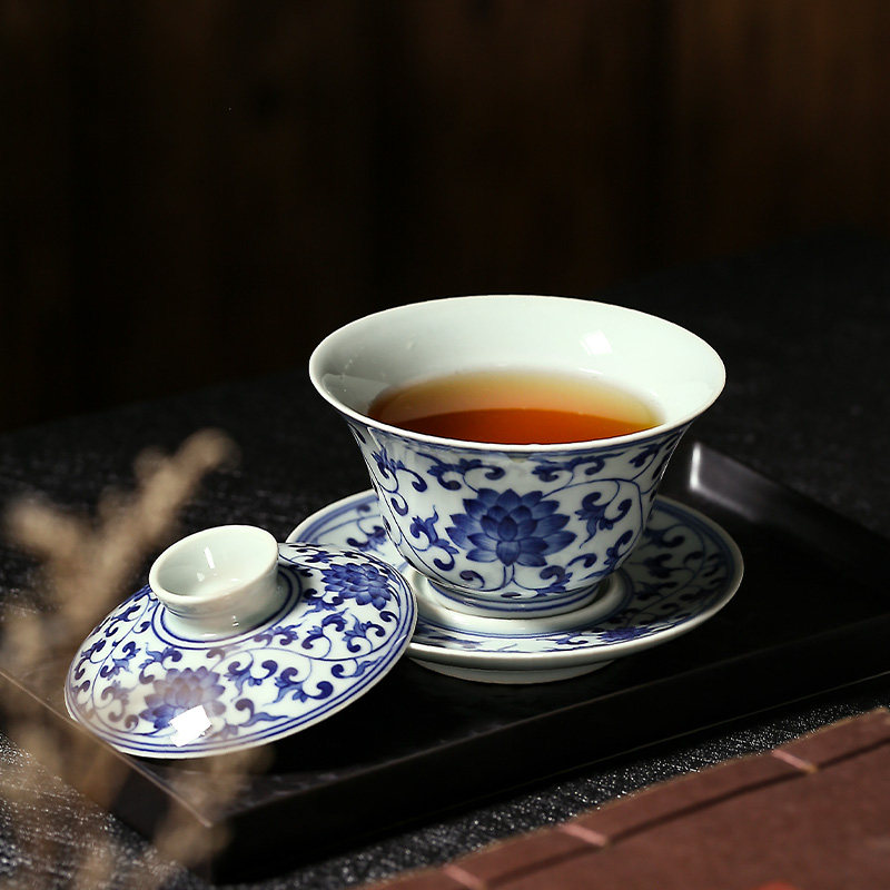 Kung fu tea hand draw branches of lotus blossom three to cover bowl of Jingdezhen thin fetal cup of tea cup retro ceramic