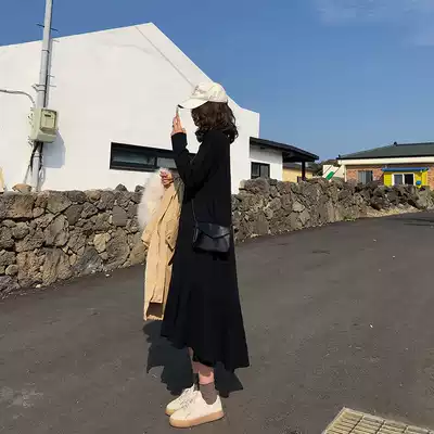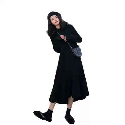 Autumn and winter loose casual knitted dress Super fairy Hepburn small black skirt French retro inner sweater inner long skirt
