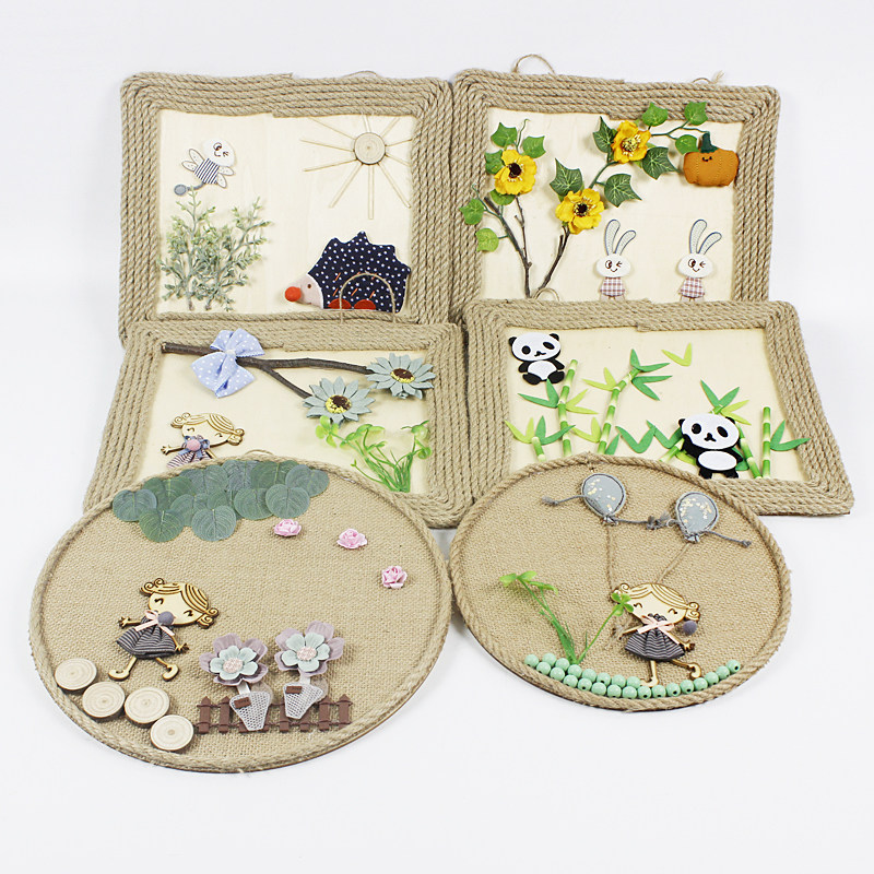 Kindergarten classroom ring creative materials Handmade works background hemp rope board hanging corridor stairs wall hanging